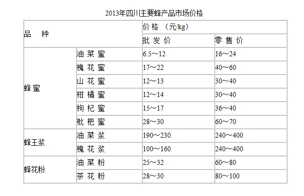 2013年,蜂产品市场收购价格涨跌互现,蜂蜜收购价格变化不大,蜂王浆收购价格下降幅度较大,蜂花粉收购价格有一定上升,而蜂产品市场零售价格基本保持不变。油菜蜂蜜收购价格在6.5元/kg~10.0元/kg之间,省内油菜蜜收购价格比上年同期减少约10%左右,而青海油菜蜜收购价格比上年略有上升。槐花蜂蜜收购价格为17元/kg~22元/kg,比上年同期略有升高。柑橘蜂蜜的收购价12元/kg~14元/kg、山花蜂蜜收购价12.0元/kg~13.0元/kg、向日葵蜂蜜收购价格7.0元/kg~8.0元/kg、枇杷蜂蜜收购价28.0元/kg~30.0元/kg,与上年同期基本持平。枸杞蜂蜜收购价为15元/kg~17.0元/kg,比上年略有下降。省内盆周山区生产的荆条、乌桕、山花等中蜂蜜主要在当地零售,价格大致在40元/kg~120元/kg之间,与上年基本持平。蜂王浆价格变化较大,其中省内油菜蜂王浆收购价格在190元/kg~230元/kg之间,比上年同期增长15%左右,而陕西、甘肃、青海的槐花和油菜蜂王浆收购价在100元/kg~160元/kg之间,比上年同期下跌20%~25%。青海油菜花粉收购价为25元/kg~28元/kg之间,比上年同期上涨38%;省内茶花粉收购价为24-30元/kg之间,与去年基本持平。