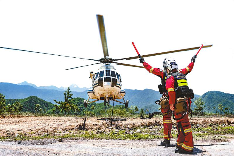 在近日举行的全省防灾减灾救灾演练中,消防员开展直升机孤岛救援。图片由四川省消防救援总队提供