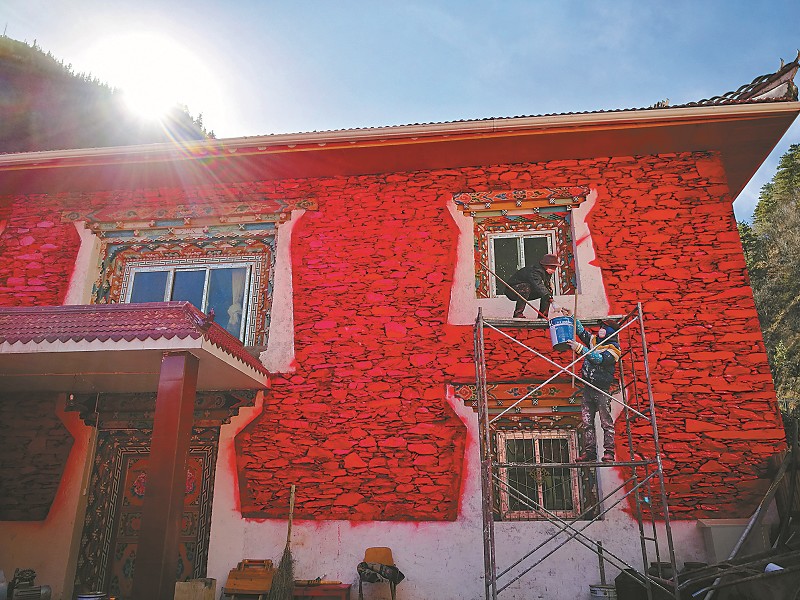 12月6日,在黑水县沙石多乡昌德村,两名工人正在为藏式民居涂油漆。寨子里民居的“红瓦屋面片石墙,雕花门窗小庭院”传统风格,吸引更多游客。