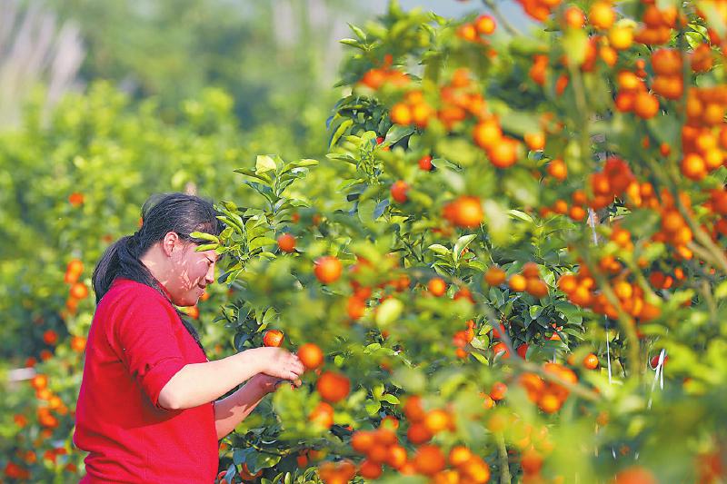 在武胜县沿口镇五一村万亩晚熟柑橘产业园里,果农正忙着采摘、分拣、打包、装车,并通过“订单农业”的方式将砂糖橘销往全国各地。夏俊林 摄