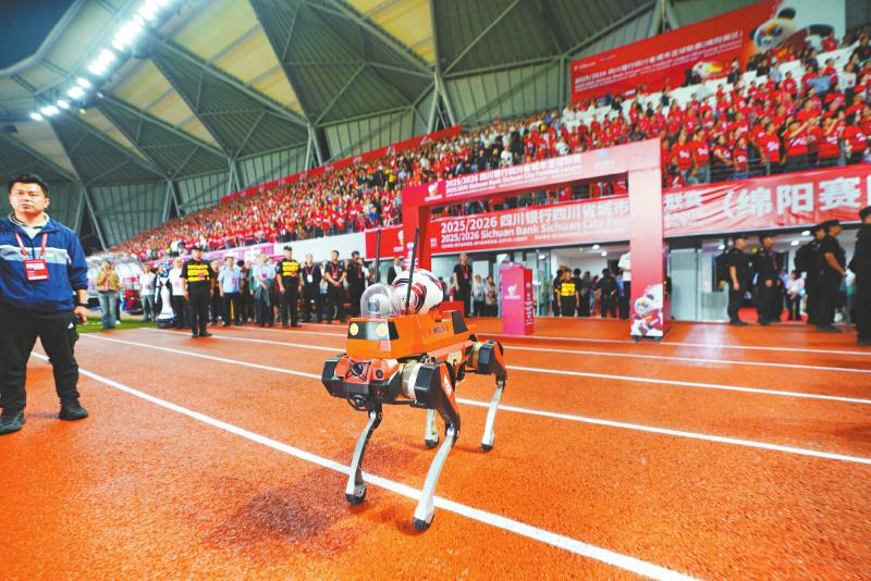 “川超”绵阳主场比赛开球仪式,“绵阳造”机器狼携球入场。郭超英 摄