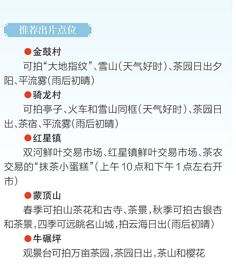 在王治看来,在成都拍雪山,多是自然美景与都市高楼的视觉碰撞。而在雅安,拍雪山有茶山辉映,茶农在“大地指纹”般的茶田采茶,更具意蕴之美。此外,金鼓村、双河村等地,还有动车、平流雾、樱花、茶鲜叶交易市场等丰富的视觉场景,看点多多。