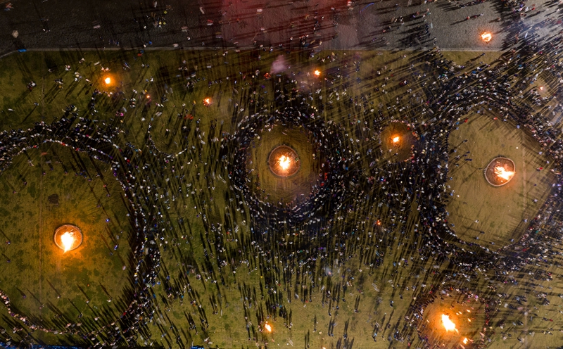 2024年7月22日,在布拖县火把广场,人们围着火堆跳起达体舞(无人机照片)。新华社记者 江宏景 摄