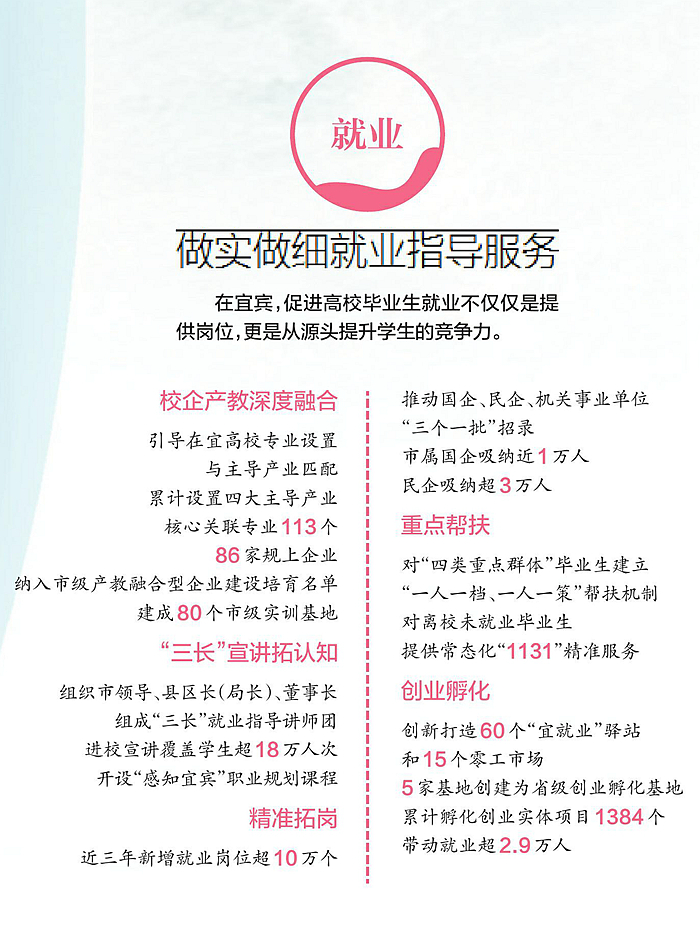 产业发展离不开人才支撑。宜宾大力兴教,让城市围绕大学建、产业依托教育兴,先后引进12所高校入驻,今年又有两所高校获批落地,是省内除成都以外最大的本科及以上层次高校聚集地。宜宾引导这些高校“随产而动、应需而调”,以产业端人才需求为牵引,设置四大主导产业核心关联专业113个。近三年来,宜宾大力推动产业转型,新增就业岗位超过10万个,其中绝大部分是留宜高校毕业生。
