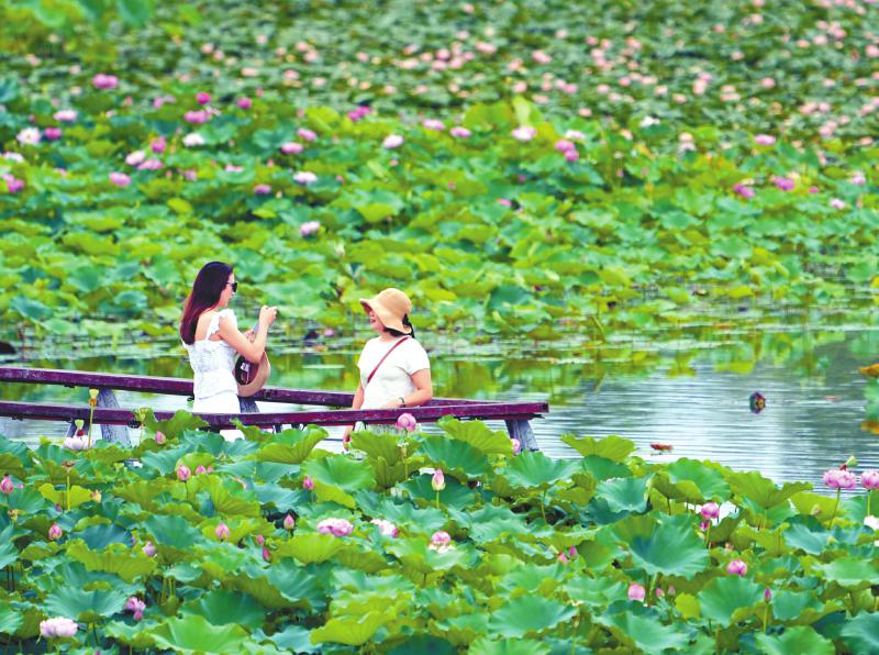 遂宁市船山区圣莲岛世界荷花博览园荷花盛开,吸引游客打卡。钟敏 摄(C视觉)