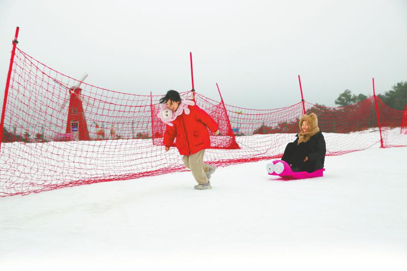 游客在巴山大峡谷罗盘顶滑雪场玩雪。宣汉县委宣传部供图