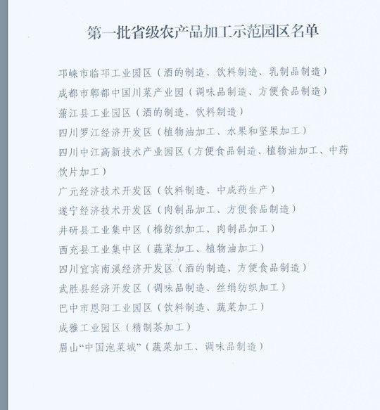 近日,四川省经济和信息化厅公布了第一批省级农产品加工示范园区名单,邛崃市临邛工业园区、成都市郫都中国川菜产业园等14家园区榜上有名。