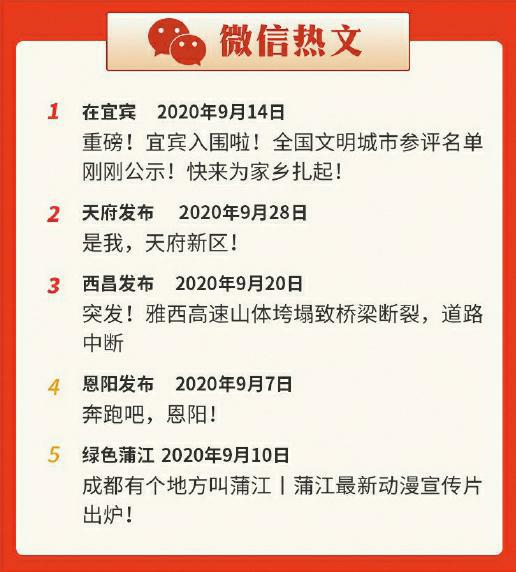 本期指数共纳入统计微信账号8110个、微信文章26.2万余篇,其中阅读量达“10万+”的文章共6篇,题材主要为地方城市宣传。同时,本期指数共纳入统计微博账号11442个,月累计点赞量前五名账号依次为“成都青白江”“成华发布”“叙永法院”“给力都江堰”“双流网”。