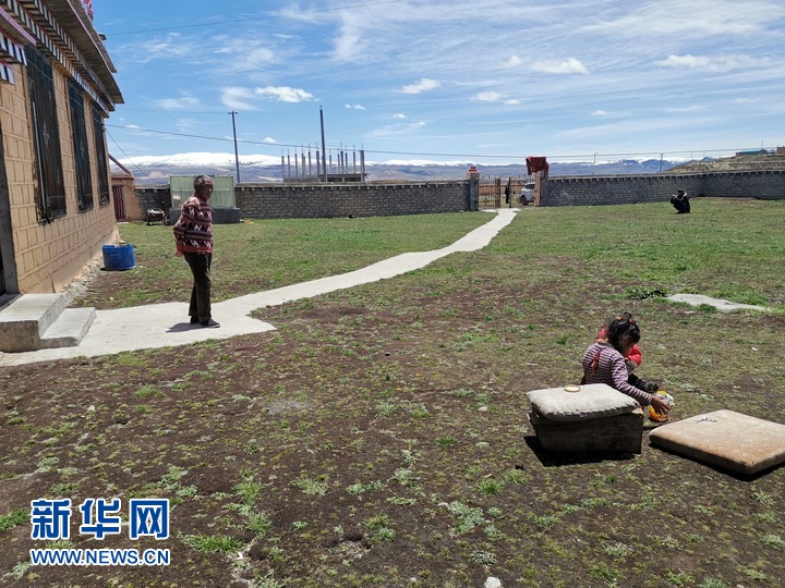 四川省甘孜藏族自治州理塘县奔戈乡卡灰村村民洛登(左一)在家门口(2020年5月30日摄)。