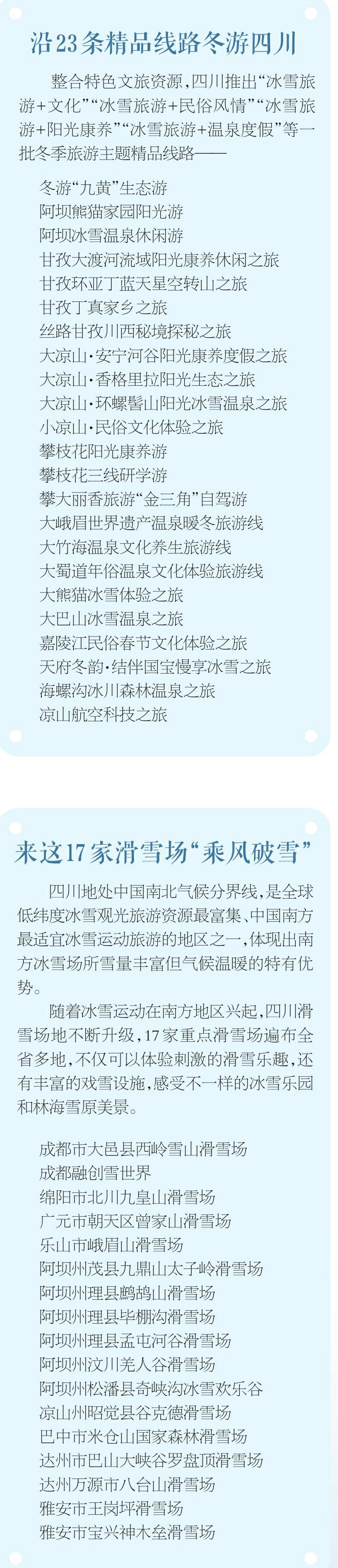 为贯彻落实2023四川省文化和旅游发展大会精神,持续擦亮四川冬季旅游“冰雪”“温泉”“阳光”三张名片,促进全省冬季旅游市场繁荣发展,2023年“冬游四川消费季”围绕“赏蜀山冰雪·享攀西暖阳”主题,推出六大系列优惠政策,开展六项重点促销活动,推介23条冬季旅游主题精品线路和17家重点滑雪场。