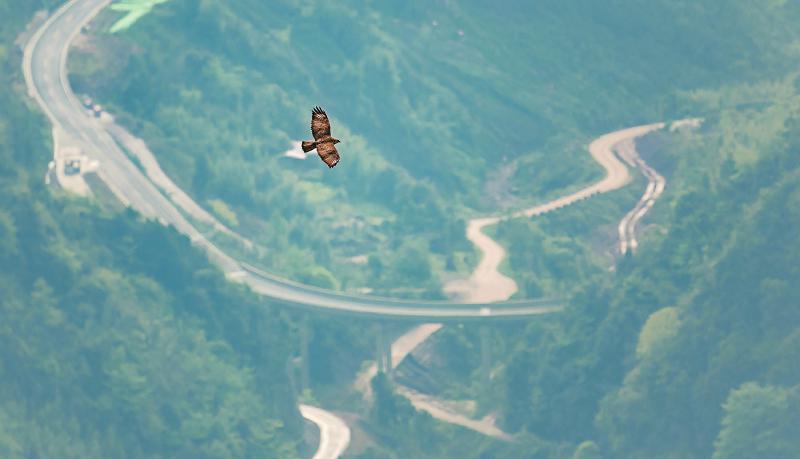 普通鵟翱翔在成都市崇州市都统岩上空。