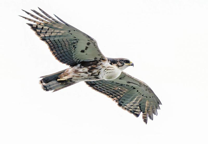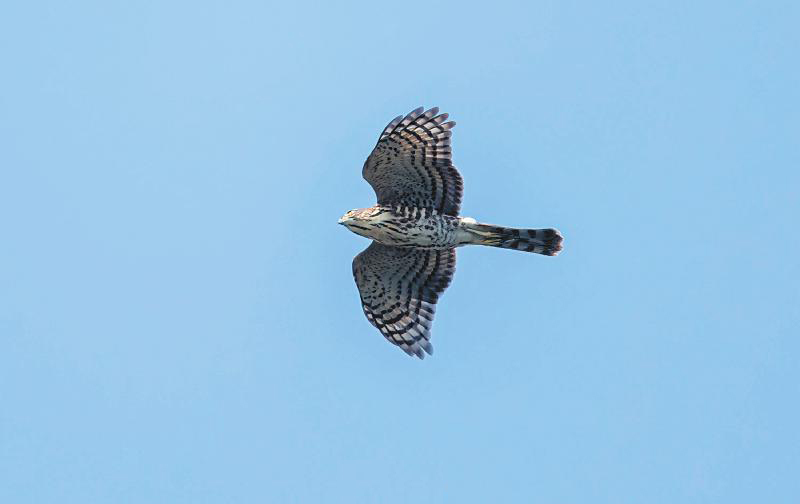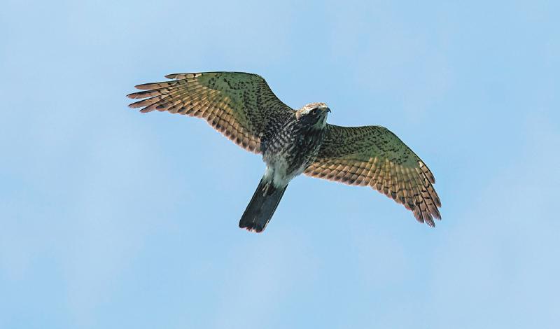 9月,成都盆地大部分天气是阴雨天气。10月13、14日是10月里难得的好天气,按以往监测规律推算,大量因天气原因滞留在路上的猛禽,会在这个窗口期抓紧过境。为迎接这个监测的高峰期,迁徙猛禽监测团队的志愿者在崇州市都统岩和彭州牛心山监测点连续蹲守了两天,共记录到了近900只过境猛禽。据黄拓讲,14日下午2点15分左右,一只飞行姿态稳健的巨大猛禽闯入了监测人员的望远镜,“快看!”听到一声惊呼,黄拓本能地抓起配备有超长焦镜头的相机对着它就是一阵狂拍。“当时看了照片,大家都没太在意,以为是常见的凤头蜂鹰。直到10天后,志愿者王三月再次翻看这些照片,感觉有所不同,随即与其他资深志愿者联系。大家经过翻查图鉴和讨论,最终确认它就是棕腹隼雕。”