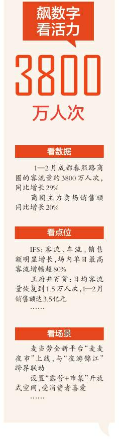 作为城市的“顶流”商圈,春熙路时尚商圈是折射成都人气商气的“窗口”。据锦江区商务局统计数据,1—2月成都春熙路商圈的客流量约3800万人次,同比增长29%,商圈主力卖场销售额同比增长20%。