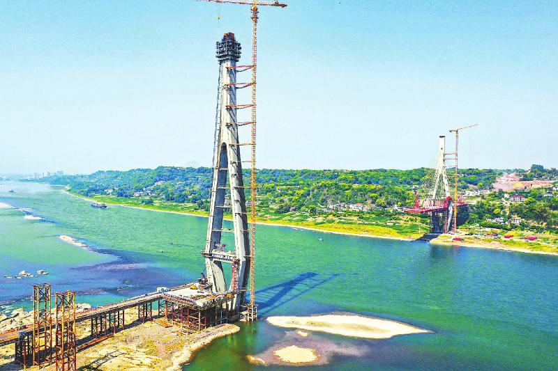 4月15日,由中交二航局承建的泸州市合江县榕山长江大桥192米高的2号桥墩索塔顶端建设正加速进行。作为我省重大基础设施项目,榕山长江大桥建成后将助力泸州加快融入成渝地区双城经济圈。李贵平 摄(视觉四川)