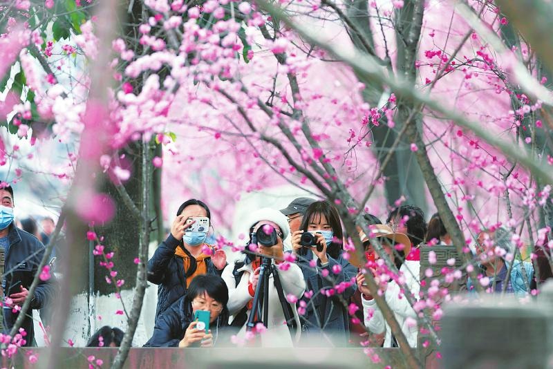 2月15日,在成都望江楼公园,前来赏花赏景的市民在拍摄盛放的春梅。记者 黄潇 摄