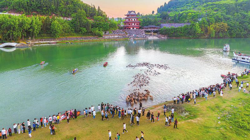 5月4日,游客在南充市蓬安县观看“百牛渡江”盛况。张波 摄(C视觉)