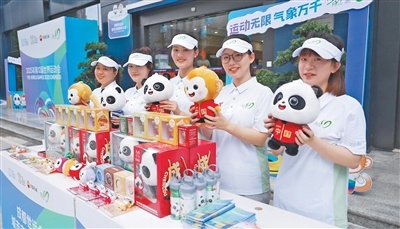 志愿者展示成都世运会文创产品。记者 宋豪新 摄