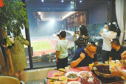 • 成都双流体育中心附近居民在窗台边吃火锅边看比赛。