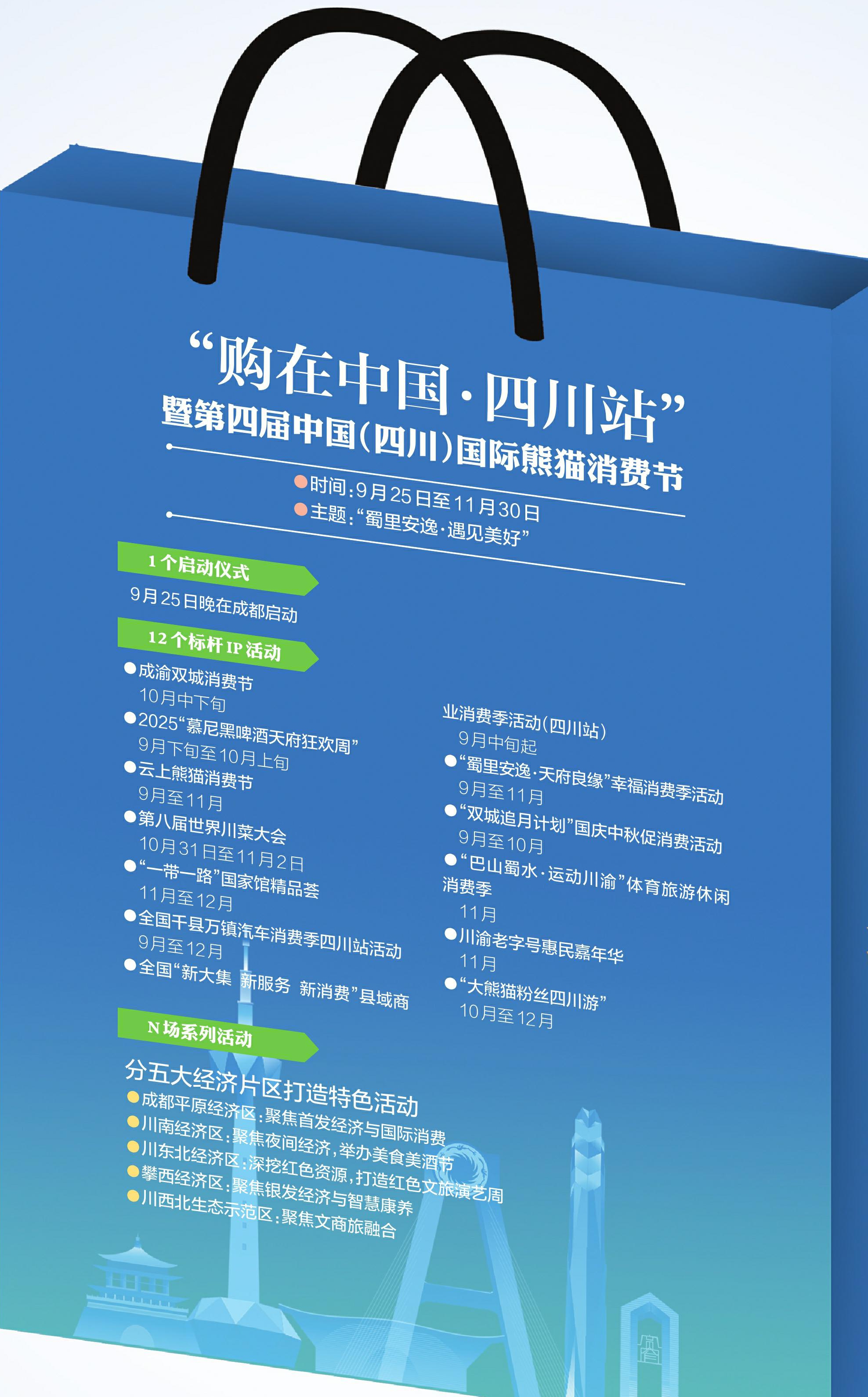 本次消费节作为“购在中国”的重要标志性活动,为进一步提升入境消费、外来消费体验,活动期间四川将聚焦精品购物、精致美食、精美旅游、精彩展赛开展一系列活动,将举办超100场首秀首展活动,推出20条特色美食街和500家必吃烟火小店,联合高德发布川菜美食“扫街榜单”,举行2025“慕尼黑啤酒天府狂欢周”、第二届大熊猫粉丝四川游等活动。