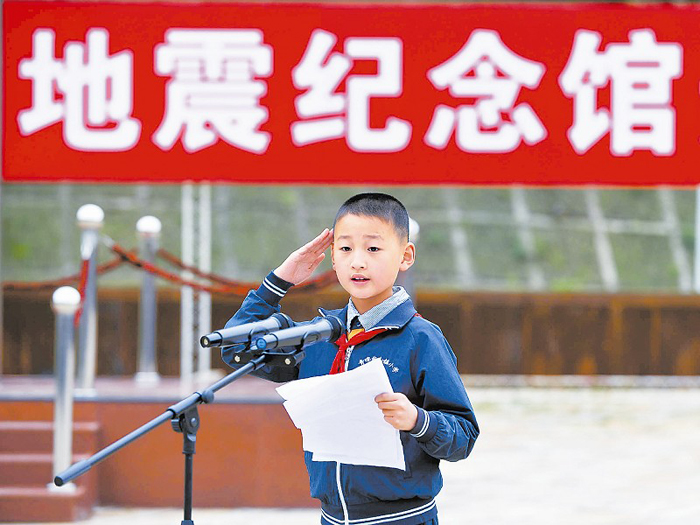 在“5·12”汶川特大地震纪念馆前,“敬礼娃娃”郎铮再次敬礼感恩。(记者 肖雨杨 摄)