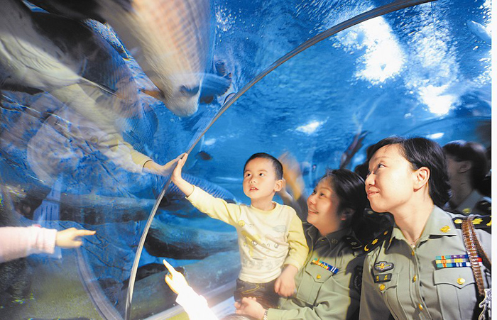 “地震宝宝”张宏扬到上海探望为他接生的“兵妈妈”,“兵妈妈”们带他到海洋馆参观。(新华社记者 沈鹏 摄)