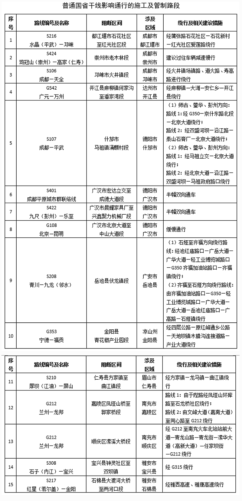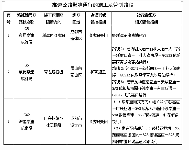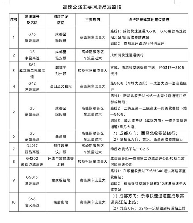 另外,四川公安交警还发布了10段高速公路主要拥堵易发路段,10段普通国省干线主要拥堵易发路段;3段高速公路影响通行的施工及管制路段,15段普通国省干线影响通行的施工及管制路段。