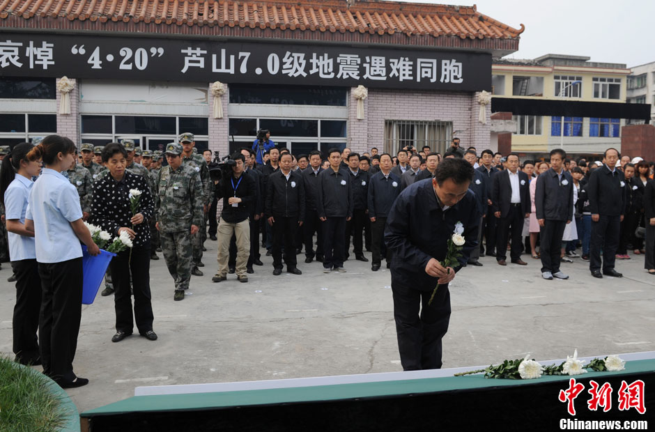 4月27日8时02分,四川社会各界代表在芦山县城举行仪式,哀悼在芦山“4·20”7级强震中不幸遇难的同胞。警报器低沉的鸣响声,回荡在芦山城上空,足足持续3分钟。图为四川省省长魏宏向遇难同胞献花。