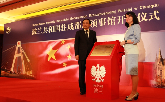 来川访问的波兰外交部副部长卡塔日娜·卡茨帕尔赤克表示,四川省和成都市对波兰有特殊意义,成都与罗兹通过蓉欧快铁紧密相连,蓉欧快铁的开通运行也有利于中波双方推动中国“一带一路”战略的落实,相信通过波兰驻成都总领事馆开馆,将会进一步促进波兰与中国特别是波兰与四川的关系。省委常委、常务副省长王宁与卡塔日娜·卡茨帕尔赤克共同为波兰驻成都总领事馆揭牌。波兰驻华大使塔德乌什·霍米茨基、波兰罗兹省省长维托德·斯特皮恩等中外嘉宾出席开馆仪式。