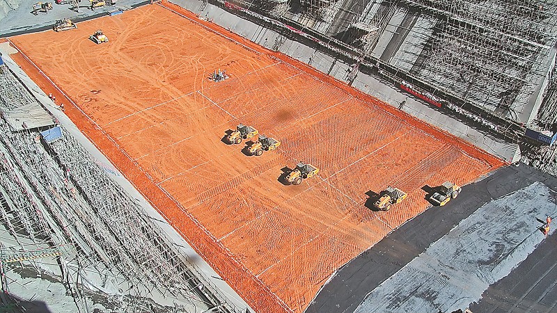 面积:近7000平方米 重量:近10吨 操作:需30个工人同时分组进行盖“被子”前,和标准足球场一样大的大坝心墙填筑现场。
