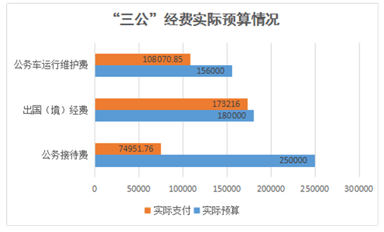 “三公”经费支出情况:“三公”经费预算58.6万元,实际支付356238.61元。其中公务接待费预算25万元,实际支付74951.76元,接待29批360人;因公出国(境)费预算18万元,实际支付173216元,组团2次人数3人;公车运行维护费预算15.6万元,实际支付108070.85元。