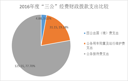 2016年度“三公”经费财政拨款支出决算中,因公出国(境)费支出决算4.88万元,占3.02%;公务用车购置及运行维护费支出决算31.15万元,占19.28%;公务接待费支出决算125.55万元,占77.7%。具体情况如下: