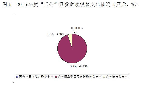 2016年度“三公”经费财政拨款支出决算中,因公出国(境)经费无支出;公务用车购置及运行维护费支出决算4.81万元,占95.06%;公务接待费支出决算0.25万元,占4.94%。具体情况如下: