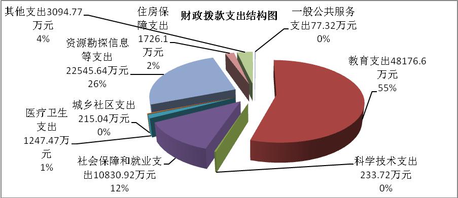 1.财政拨款收入:指省级财政当年拨付的资金。其中:一般公共服务支出77.32万元;教育支出48176.6万元;科学技术支出233.72万元;社会保障和就业支出10830.92万元;医疗卫生支出1247.47万元;城乡社区支出215.04万元;资源勘探信息等支出22545.64万元;住房保障支出1726.1万元;其他支出3094.77万元%。