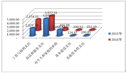 2016年本年支出合计8,061.15万元,其中:基本支出4,302.79万元,占53%;项目支出3,758.35万元,占47%。2016年本年支出合计较2015年减少656.61万元,下降7%,变动的主要原因是:工资与福利支出增加896.72万元,商品和服务支出减少668.67万元,对个人和家庭的补助减少1,001.95万元,基本建设支出增加66.05万元,其他资本性支出增加51.25万元。(图2)
