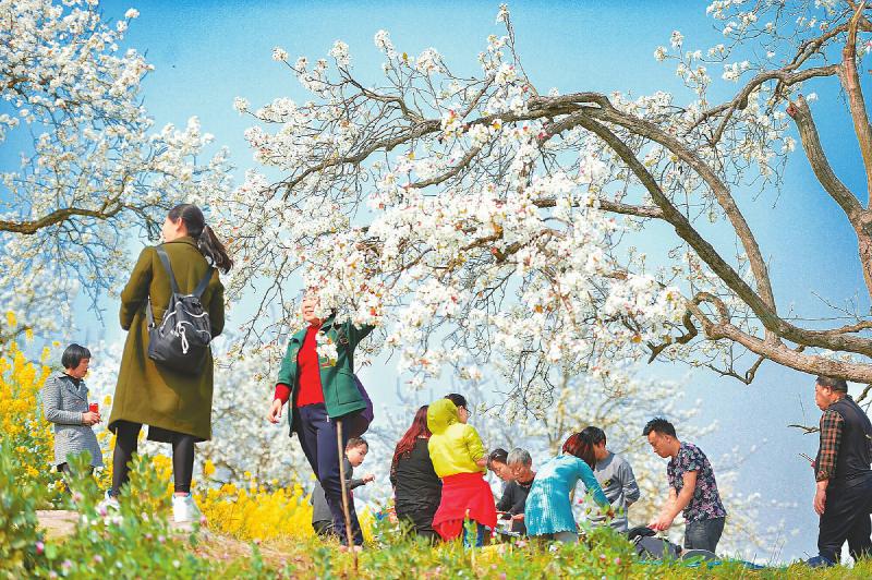 自贡市大安区三多寨梨花盛开,吸引众多游客前来赏花。