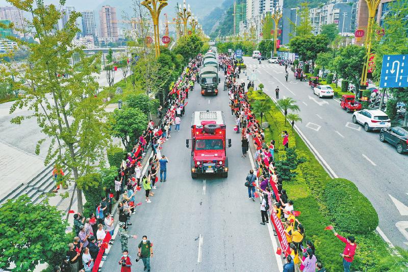 石棉县河北路迎宾大道,人们站在道路两侧送别救援队伍。黄刚 摄(视觉四川)