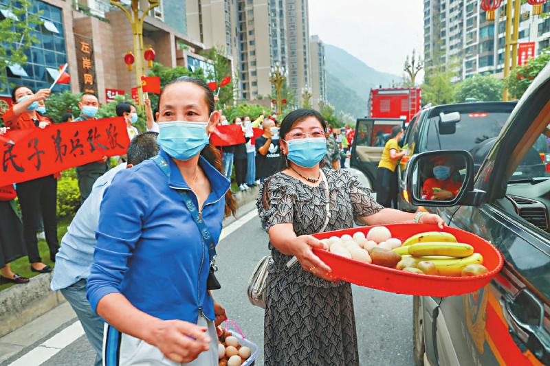 石棉县群众送上鸡蛋、香蕉等,表达感激之情。黄刚 摄(视觉四川)