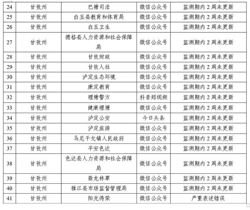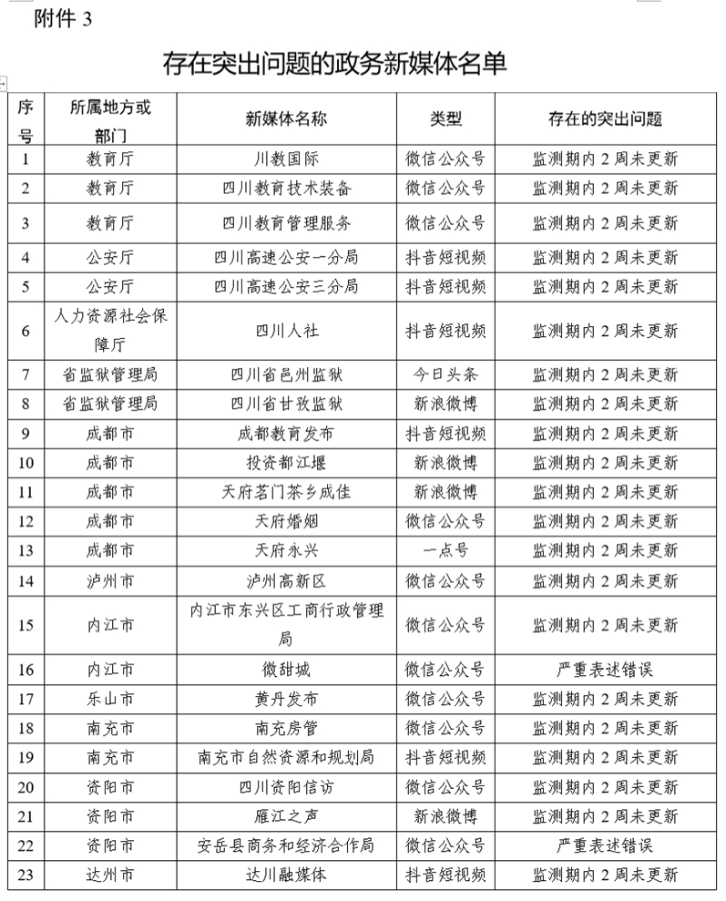 (二)政务新媒体。总共检查了3600个账号,其中全覆盖检查了代表主体为各级政府的账号,以及省直部门(单位)账号;抽查了2864个市(州)及县(市、区)部门账号,抽查率达63.41%。发现存在突出问题的账号41个,合格率达98.86%,自贡、遂宁、攀枝花、凉山等13个市(州)合格率较高。