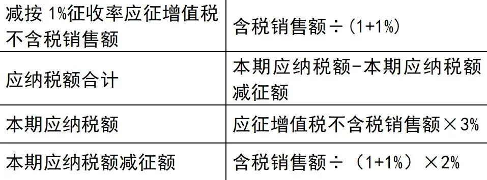 小规模纳税人发生增值税应税销售行为,合计月销售额超过10万元的,减按1%征收率征收增值税的销售额应填写在《增值税及附加税费申报表(小规模纳税人适用)》“应征增值税不含税销售额(3%征收率)”相应栏次,对应减征的增值税应纳税额按销售额的2%计算填写在《增值税及附加税费申报表(小规模纳税人适用)》“本期应纳税额减征额”及《增值税减免税申报明细表》减税项目相应栏次。适用3%征收率销售收入减按1%征收政策的增值税小规模纳税人,销售额的计算公式为:销售额=含税销售额/(1+1%)。