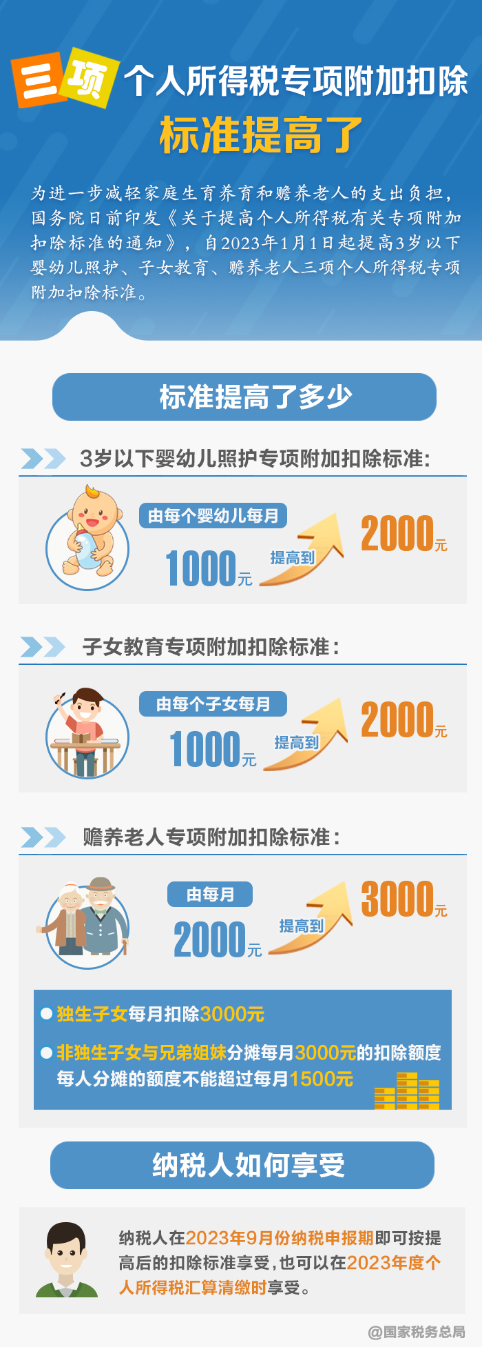 根据通知,自2023年1月1日起,3岁以下婴幼儿照护专项附加扣除标准,由每个婴幼儿每月1000元提高到2000元;子女教育专项附加扣除标准,由每个子女每月1000元提高到2000元。