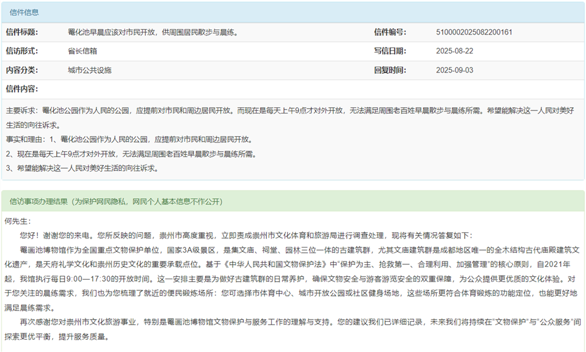 罨化池早晨应该对市民开放,供周围居民散步与晨练