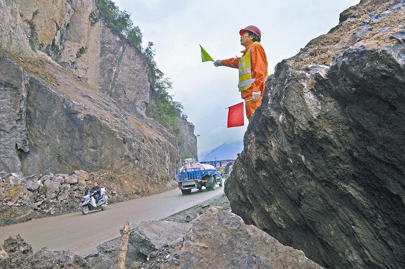 除了卡口,部分民警“变身”为地质观察员。他们头戴亮白色安全帽,手拿旗子,有时抬头望山,有时低头观察通过车辆。