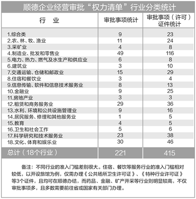 顺德整理发布企业经营审批事项目录汇编,梳理出18大行业共计221个审批事项。有了这份“权力清单”,企业在办理审批事项时不会再被部门“牵着鼻子走”,而职能部门的权力边界和监管职责也更加明晰。