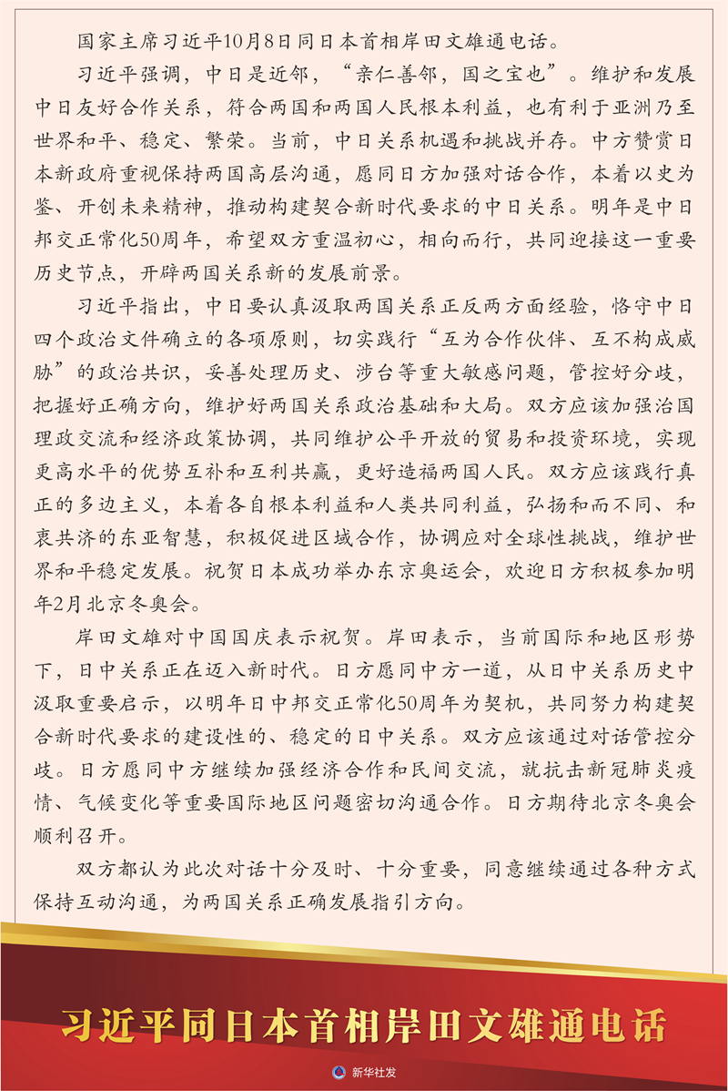 国家主席习近平10月8日同日本首相岸田文雄通电话。