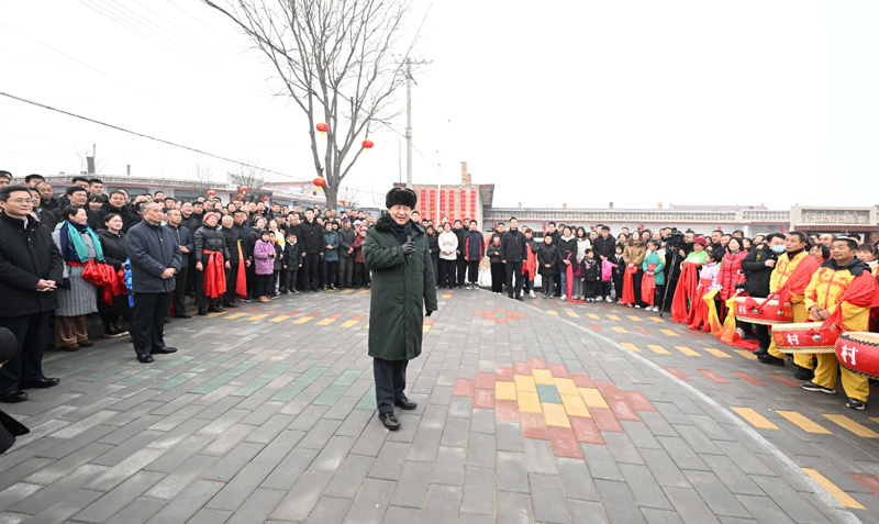 1月26日至27日,中共中央总书记、国家主席、中央军委主席习近平来到山西,看望慰问基层干部群众。这是26日下午,习近平在临汾市汾西县僧念镇段村文化广场,给乡亲们拜年,向全国各族人民、向港澳台同胞和海外侨胞致以美好的新春祝福。 新华社记者 燕雁 摄