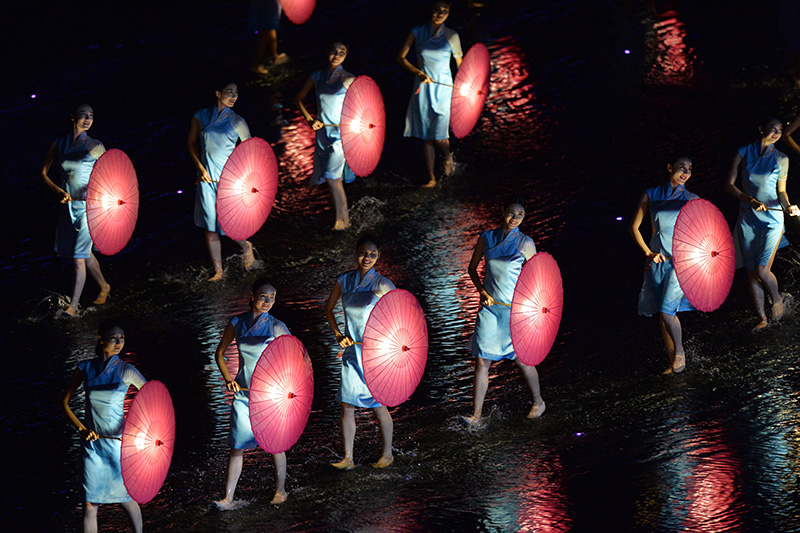 演员在西湖景区进行的G20杭州峰会文艺演出《最忆是杭州》中表演《难忘茉莉花》(2016年9月4日摄)。新华社记者 黄宗治 摄