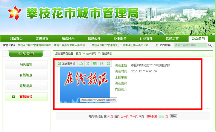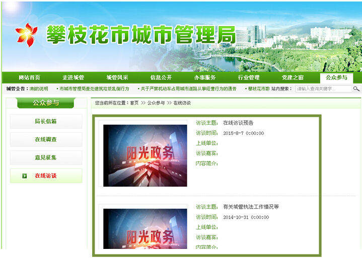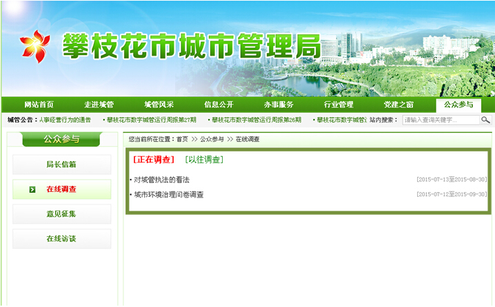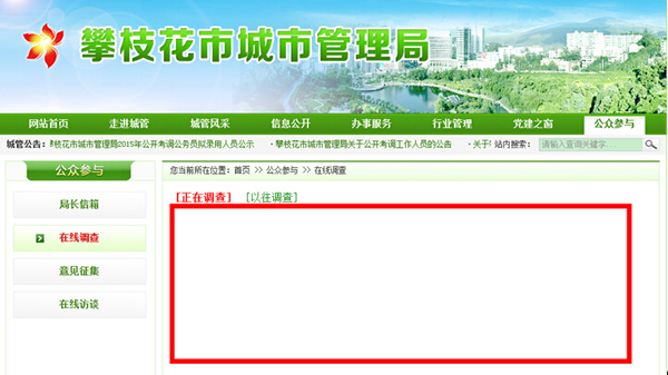 网友通过“四川省政府网站普查在线举报平台”,反映攀枝花市城市管理局网站公众参与栏目中,在线调查无内容、在线访谈只有一次,而且内容为2010年12月的。