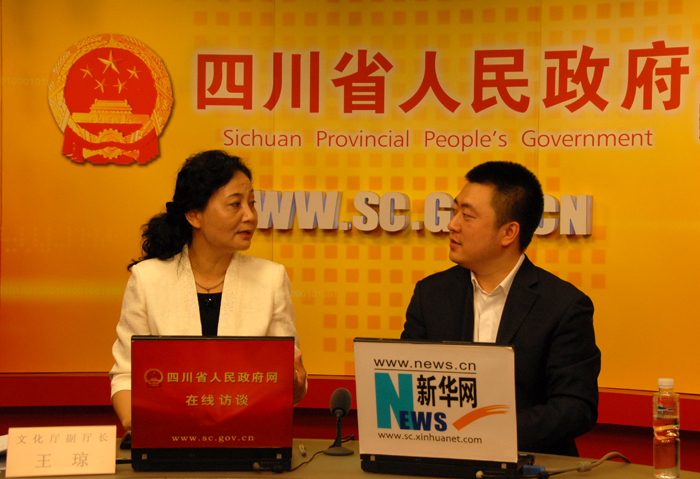 文化厅副厅长王琼同志接受四川省人民政府网站专访并与网友在线交流。图为王琼与主持人进行交流。