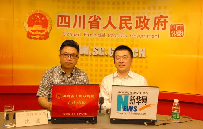 省工商局副局长沈健同志接受四川省人民政府网站专访并与网友在线交流。图为沈健进入省政府网访谈室。
