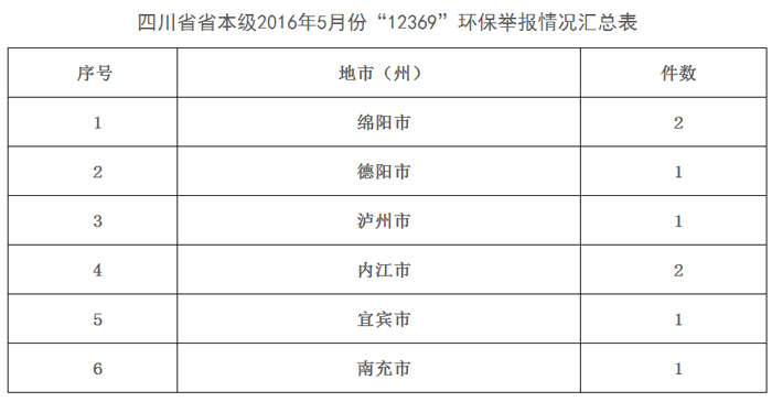 2016年5月四川省省本级“12369”环保举报热线投诉处理结果